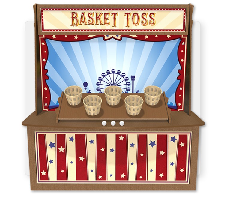 BASKET TOSS Premium Wood GamesSet of Carnival Games Premium Wood Games:BASKET TOSS Premium Wood Games1Dropdown12385699_22631290100 The basket toss is a popular carnival game where players aim to toss balls into baskets to win prizes. It's a test of aim and precision.