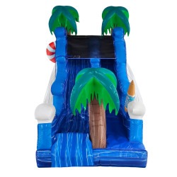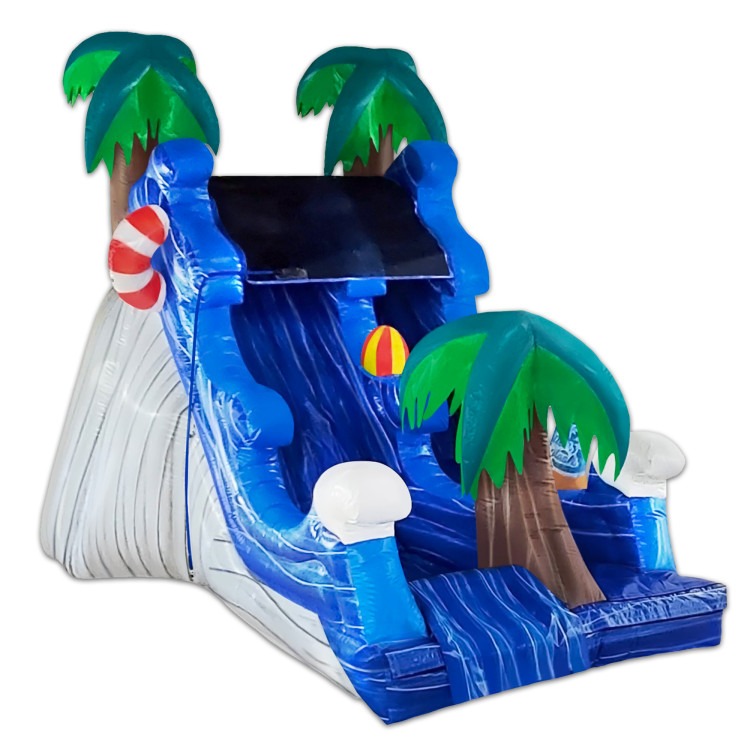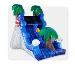 Size 16’ W x 40’ L x 18’ H Power 1 outlet The Malibu Splash Slide! A great addition to the wet and dry slides, the 17' Malibu Splash Slide is a must-have. Riders will feel like they are riding a wave— the slide features inflatable palm trees, waves, and a beach ball, giving you beach vibes. The 17' Malibu Splash will be a huge hit and enjoyed by everyone. The compact and lightweight design will make for easy setup and cleanup. This slide has so many features great for operators, like our easy-to-use water misting system. You never have to worry about removing and installing the system or having to readjust it. There is non-slip material on the climbing area, top landing platform, and certain pool areas. Like our other wet and dry slides the pool area has a raised wall for safety and to prevent water from splashing out. If you don't want the pool attachment, you can opt for the landing area instead. The slide features drain flaps at the bottom corners of the inflatable for easy removal of any water that may get trapped inside. To use the 17' Malibu Splash Slide dry all you have to do is detach the removable pool, secure the hook and loop fasteners, expose the hidden stopper at the end, and it's ready to use as a dry slide. Place your orders for the 17' Malibu Splash Slide Wet or dry today!