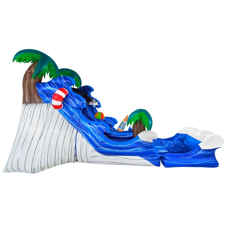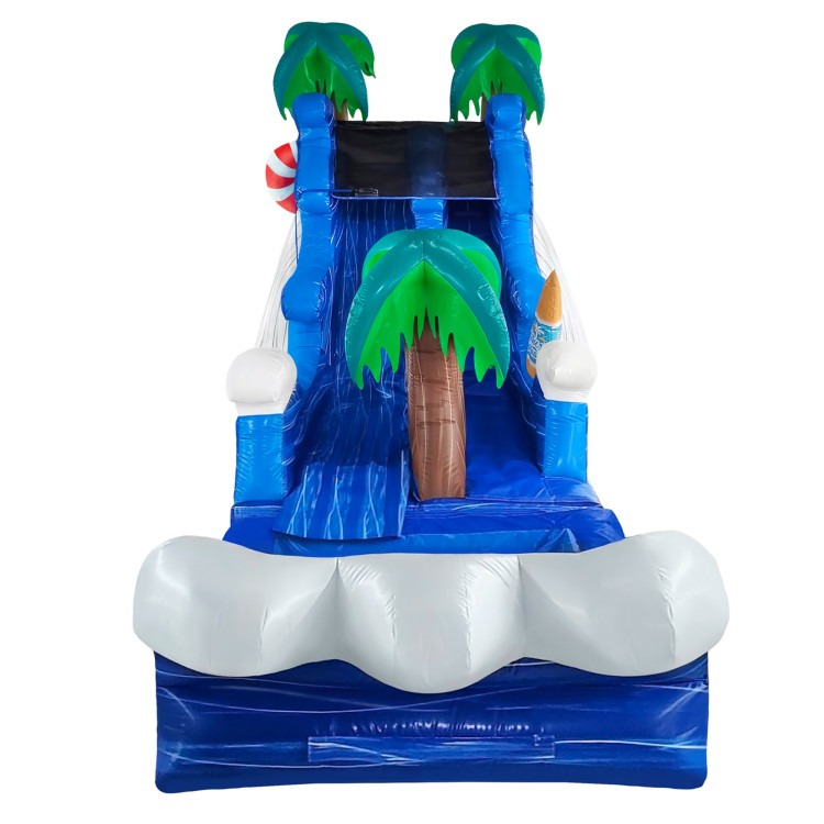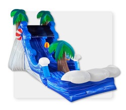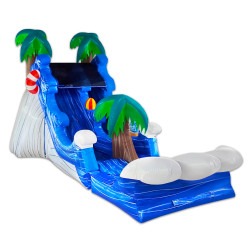 Size 16’ W x 40’ L x 18’ H Power 1-20 amp The Malibu Splash Slide! A great addition to the wet and dry slides, the 17' Malibu Splash Slide is a must-have. Riders will feel like they are riding a wave— the slide features inflatable palm trees, waves, and a beach ball, giving you beach vibes. The 17' Malibu Splash will be a huge hit and enjoyed by everyone. The compact and lightweight design will make for easy setup and cleanup. This slide has so many features great for operators, like our easy-to-use water misting system. You never have to worry about removing and installing the system or having to readjust it. There is non-slip material on the climbing area, top landing platform, and certain pool areas. Like our other wet and dry slides the pool area has a raised wall for safety and to prevent water from splashing out. If you don't want the pool attachment, you can opt for the landing area instead. The slide features drain flaps at the bottom corners of the inflatable for easy removal of any water that may get trapped inside. To use the 17' Malibu Splash Slide dry all you have to do is detach the removable pool, secure the hook and loop fasteners, expose the hidden stopper at the end, and it's ready to use as a dry slide. Place your orders for the 17' Malibu Splash Slide Wet or dry today!