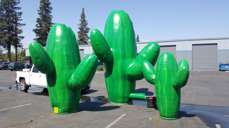 Three inflatable cactus props in varying heights