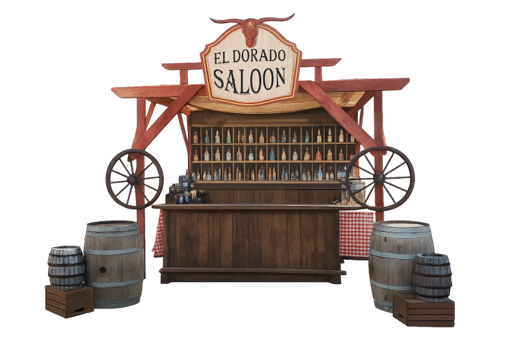 Perfect for Western, Cowboy, Old Town, Rodeo, Country, or Americana-themed events, the El Dorado Saloon works beautifully as a functional bar, focal décor piece, or photo-op backdrop. It adds character, nostalgia, and visual impact to corporate events, festivals, parties, and experiential activations.